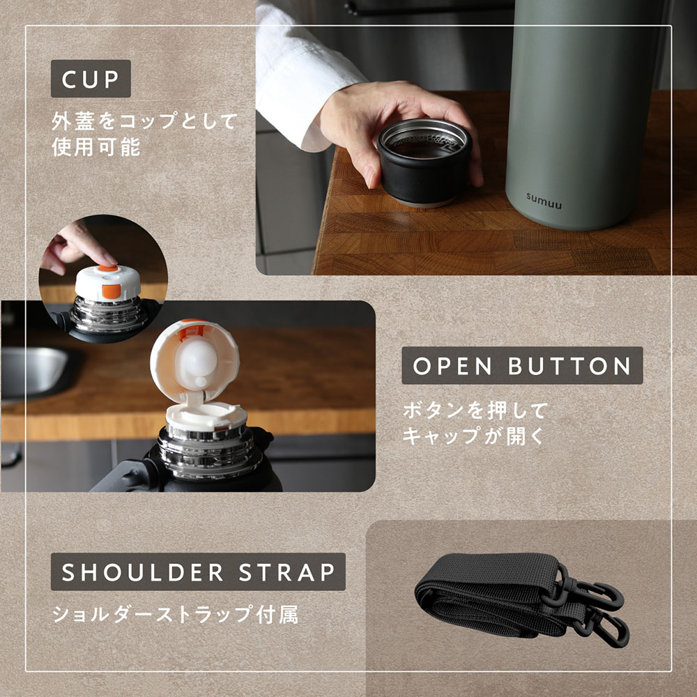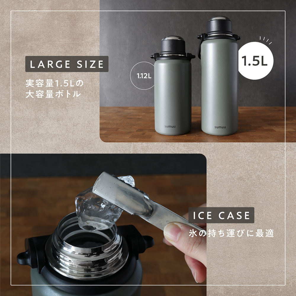 たっぷり入る超大容量ボトル。ショルダーストラップ付属。