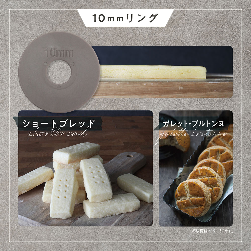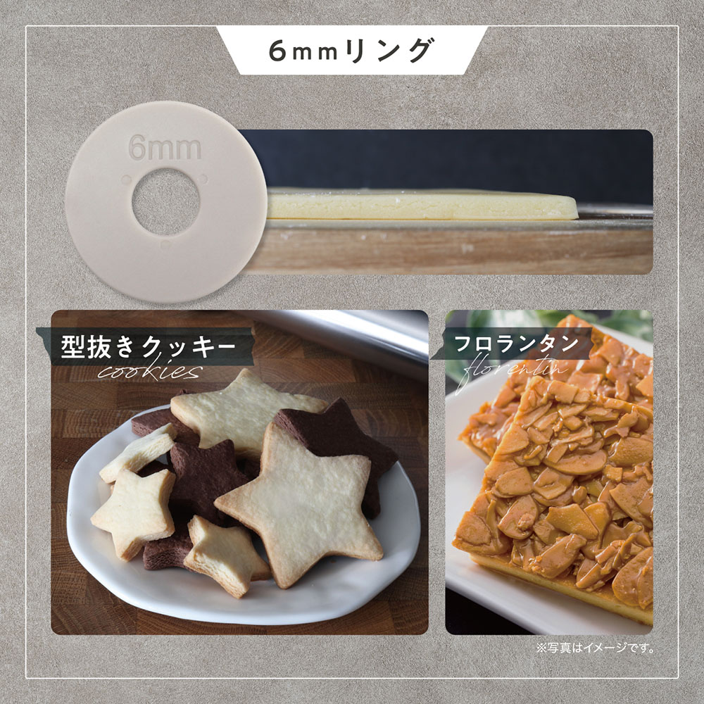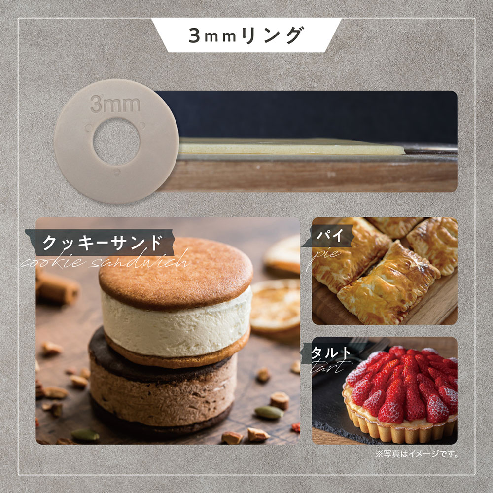 左右の厚さ調節リングを付け替えて、2/3/6/10mmに生地が伸ばせるめん棒。